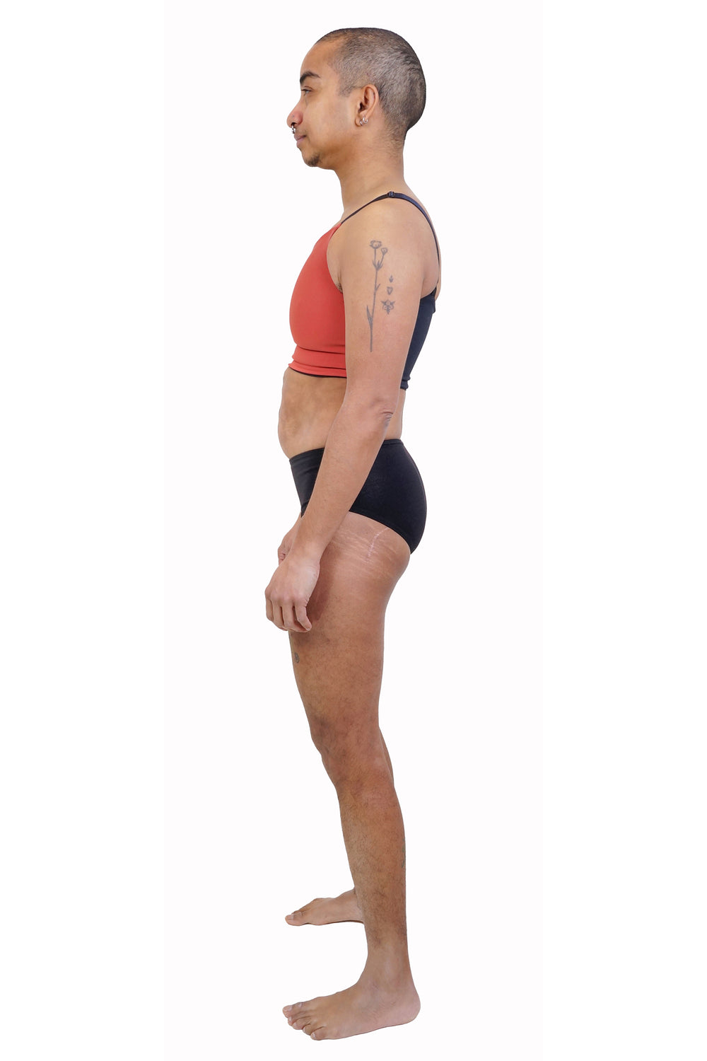 However, because the front panel has some stretch, you will experience a slight contour that you may not be used to with traditional binders. If this isn't what you want, or will increase your dysphoria, our binders may not be right for you. And that's okay!