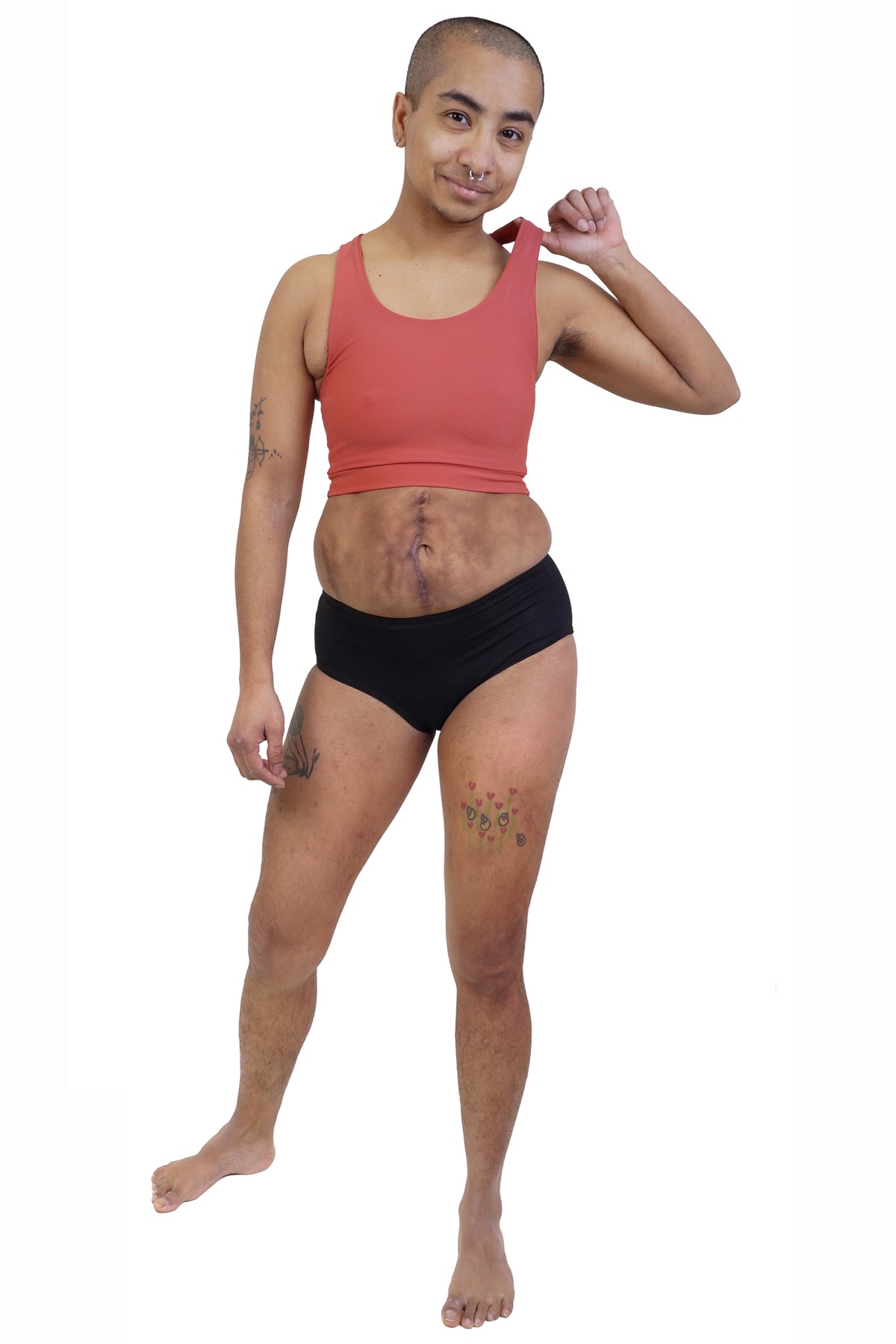 ENBY person wearing a black racerback soft chest binder made from lycra, and yellow gender affiming swim shorts, photographed from the front.